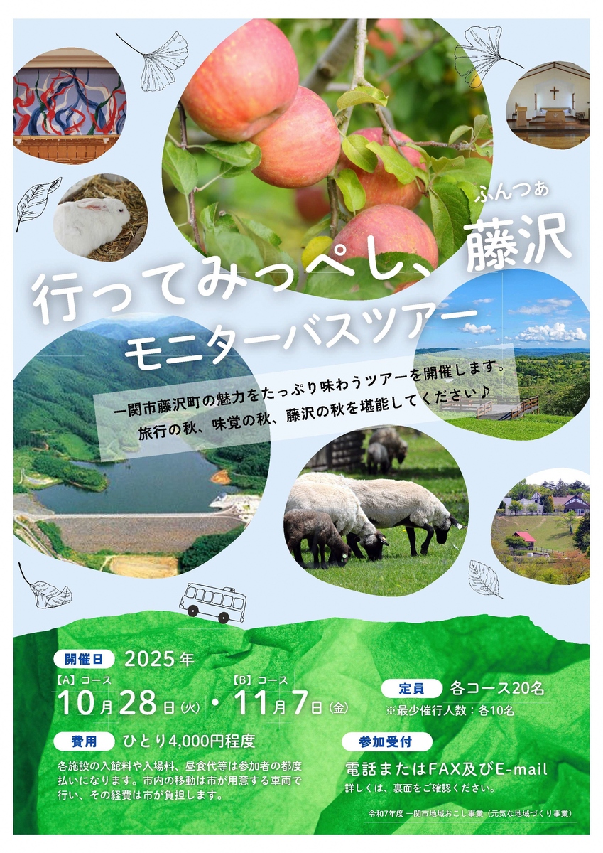 このモニターバスツアーは、藤沢町内の数多くの名所や施設などの観光資源を、もっと活かせないかという観点から企画したもので...