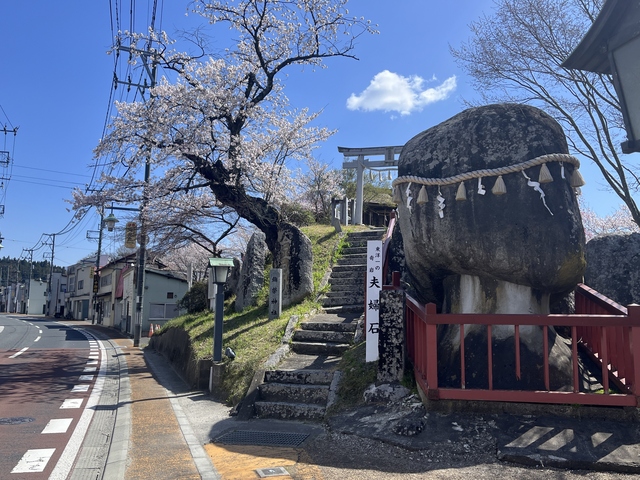 [撮影日/2026年4月12日]夫婦石は、「東洋一の奇岩」と言われており、男性を象徴する巨大な天然御影石(みかげいし)の隣に、女性を象徴する岩が寄り添っているという配置の珍しさから、千厩町随一の景観スポットとして親しまれています。 満開になると、仲睦まじく並ぶ奇岩に彩りを加えるように、見事な桜が咲きます。