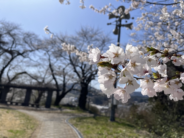 [撮影日/2026年4月21日]川沿いにある親水公園。堤防沿いにある桜並木は、開花中は家族連れでお花見が楽しめます。市内のほかのお花見スポットよりもゆっくり目に咲きますので、4月中旬頃にお花見を計画してはいかがでしょうか。 駐車場、トイレ、東屋、遊具などがあります。