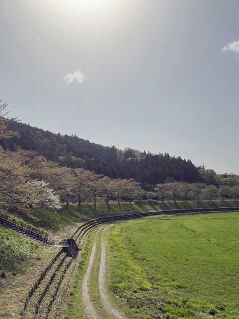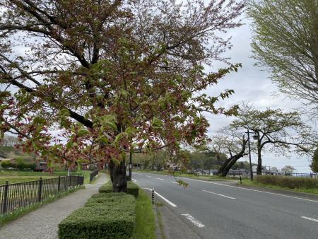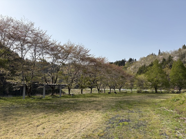 [撮影日/2026年4月21日]川崎地区の国道284号沿いを流れる千厩川の堤防には、桜をはじめ紅梅なども多く植栽されています。周辺は山や田んぼが広がるなかで、桜が一斉に開花する様子はどこか懐かしい風景を思い起こさせます。ベンチや東屋も整備されています。